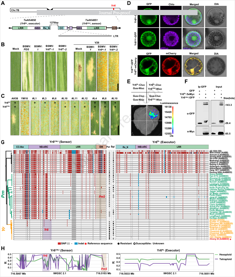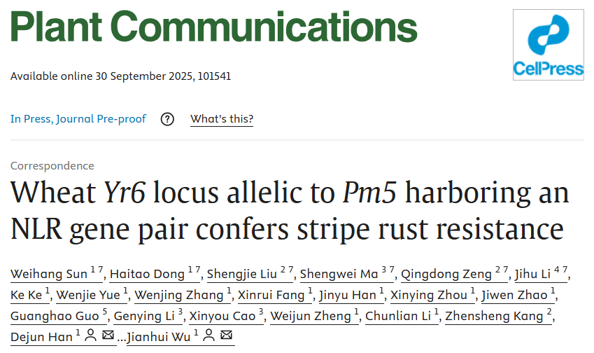 近日,js555888金沙老品牌小麦抗病团队在国际期刊《Plant Communications》发表题为“Wheat Yr6 locus allelic to Pm5 harboring an NLR gene pair confers stripe rust resistance”研究论文。该研究为利用成对NLR蛋白防控小麦多种病害提供了遗传、分子及进化层面的理论指导。