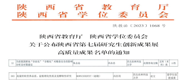 近日,陕西省教育厅、陕西省学位委员会组织举办的陕西省第七届研究生创新成果展获奖名单公布,2023年度创新成果展共收到了全省35所高校推荐的567项参展成果,最终评选出高质量成果A档55项,B档111项,C档191项。